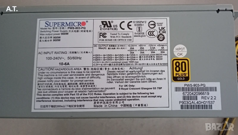 Supermicro PWS-903-PQ. Обща мощност: 900 W, AC входно напрежение: 100 - 240 V, AC входна честота: 50 - 60 Hz. Конектор за захранване на дънната платка: 24-pin ATX, Тип окабеляване: Не модулен. Предназначение: Персонален компютър, Форм-фактор на захранващото устройство (PSU): ATX, Сертификат 80 PLUS: 80 PLUS Gold. Цвят на продукта: Металик. Ширина: 150 мм, Дълбочина: 190 мм, Височина: 86 мм. Обща мощност
