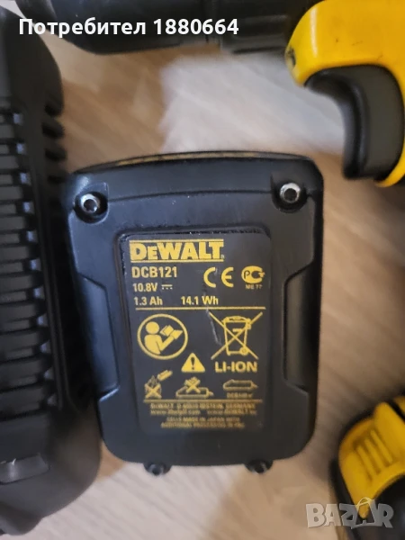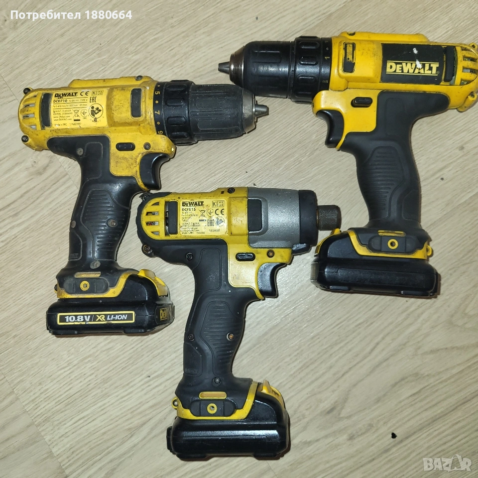 Налични 2 винтоверта модел DCD710, инпакт модел DCF915,3 батерии 1.3А и зарядно. Всичко работи перфектно. Нормални следи от употреба. Абсолютно всичко е оригинално. Цената на един винтоверт без батерия е 25 €, инпакт без батерия - 45 €, 1 батерия -15€, зарядно модел DCB100 - 30€. Само зарядно и само батерия не се продават. Други комбинации може с договаряне.
