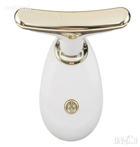 Масажор за лице и шия, подходящ за масаж против бръчки и лифтинг на лице. С бутон за стартиране на лека вибрация на главата и съответна пауза. Първо нанесете крем или масло за лице и с движения нагоре прекарайте главата по лицето, шията и деколтето. Идеален за ежедневната ви грижа за лицето! Има бутон за включване/изключване. Работи с 2 батерии AAA (не са включени). Следвайте рутинната си грижа за кожата с подбрани козметични продукти и подходящи аксесоари за масаж, тонизиране и грижа за кожата.