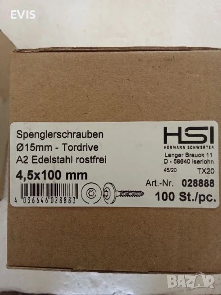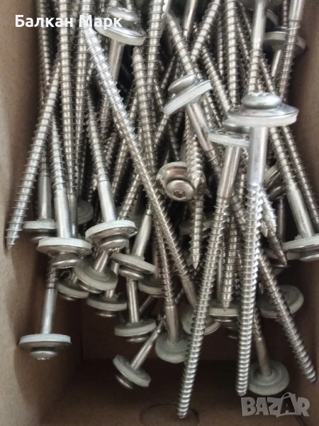 Продавам шпенглерови тенекеджийски винтове 4.5x100 мм, неръждаема стомана A2 (V2A), 100 броя в комплект, с фабрично монтирана EPDM уплътнителна шайба Ø15 мм и TORX 20 задвижване.