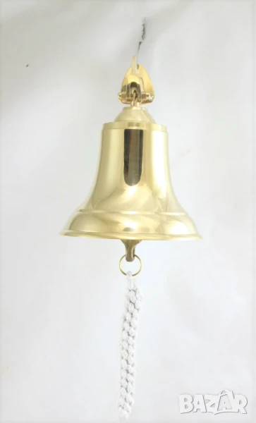 Корабна камбана от плътен месинг,полирана, с плетен рандибул -ръчна изработка.Може да се монтира на стена или на дървена поставка.Размер на камбаната – ф 150.мм