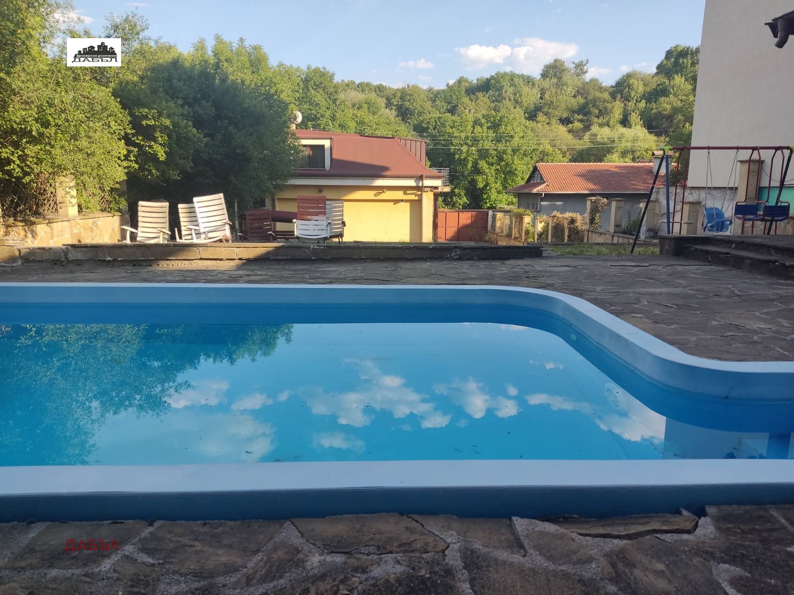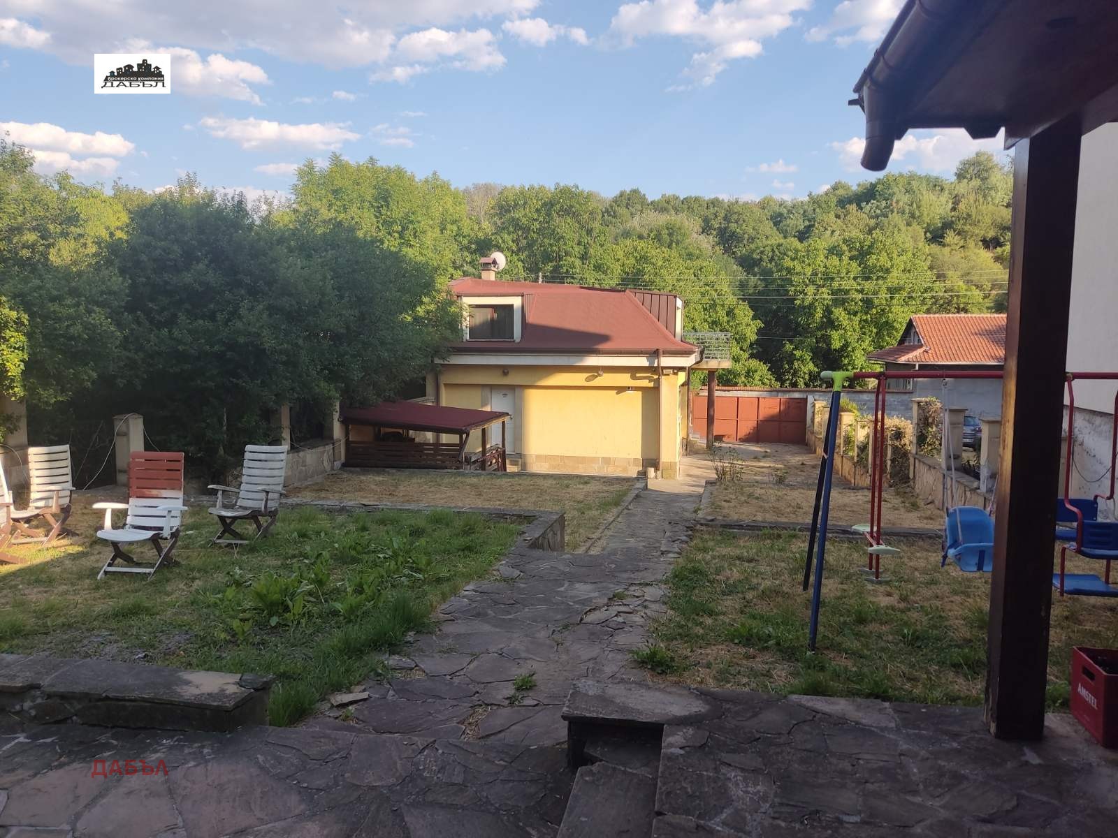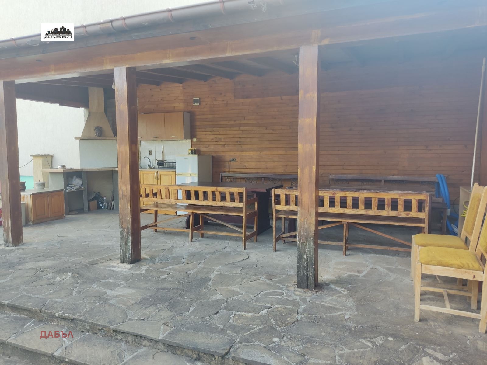 Дворното място е организирано на две основни нива, като в дъното му е изграден масивен навес - барбекю и малък басейн.