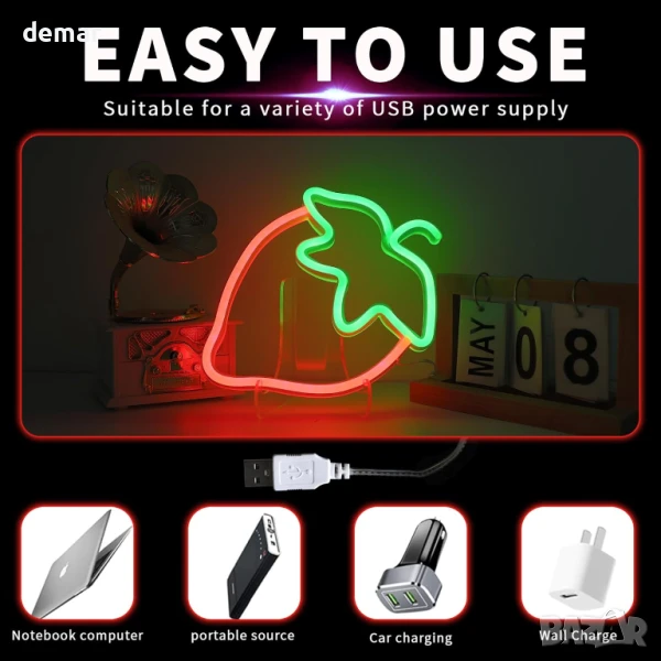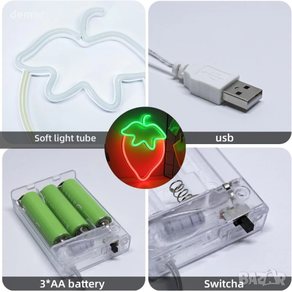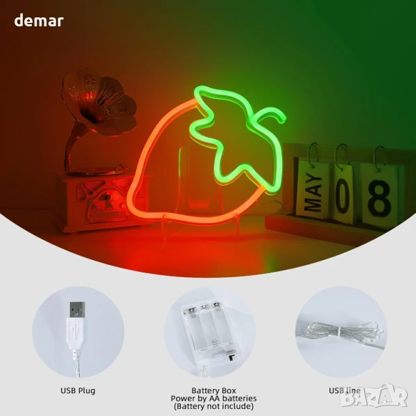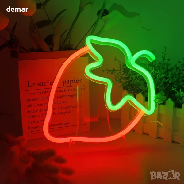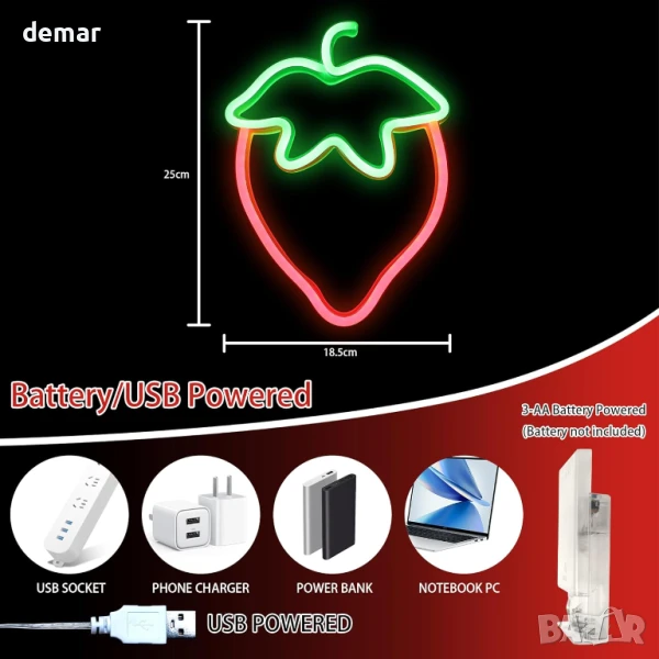 Тази LED неонова табела с форма на ягода съчетава забавна, ретро естетика с безопасни, нечупливи материали и ярка, безшумна работа – идеална за спални, кафенета или игрални пространства. Предлага опции за захранване както от USB, така и от батерии с дълъг кабел за гъвкаво поставяне, а лекият дизайн включва предварително пробити отвори за бърз монтаж на стена. Очарователен декор и добър подарък за рождени дни, партита или празнични поводи.