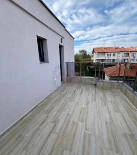 РАЗПРЕДЕЛЕНИЕ на имота: разположен на две нива. Първото ниво се състои от коридор, голям хол с кухненски бокс - 31 м2, с излаз на просторна тераса, една спалня, също с тераса, баня и тоалет, перално-килер. Вътрешно стълбище води към второто ниво, където са разположени две, отделни спални, с излаз на две тераси, които са покривни и не са включени в площта, както и прилежаща маза. Терасите са завършени с гранитогрес, стъклени парапети и гранит. Жилището е издадено по БДС. Сградата е завършена с висок клас материали, стълбището е с гранит и минерална мазилка, парапети с алуминий и стъкло в цвят антрацит, дограма със стъклопакет четири сезона.