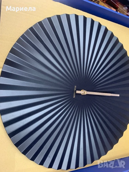 Часовника е закупен от разпродажба в Германия и е НОВ !Висококачествения стенен часовник от Karlsson модел Sensu, в дизайнерски стил от черна вълнообразна стомана, без циферблат, със златни стрелки.