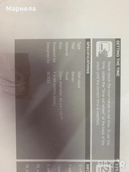 Кварцов механизъм, захранван от батерии, изисква 1 x AA батерия (включена) .