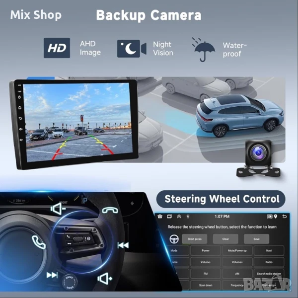 Камера за заден ход и управление от волана: Авторадиото е оборудвано с усъвършенствана AHD задна камера, която лесно се свързва чрез видео входния порт и автоматично показва задния изглед при движение на заден ход, подпомагайки безопасното паркиране. Същевременно поддържа функция за управление от волана, която ви позволява да управлявате радиото, без да напускате волана по време на шофиране, наслаждавайки се на удобно изживяване при работа.