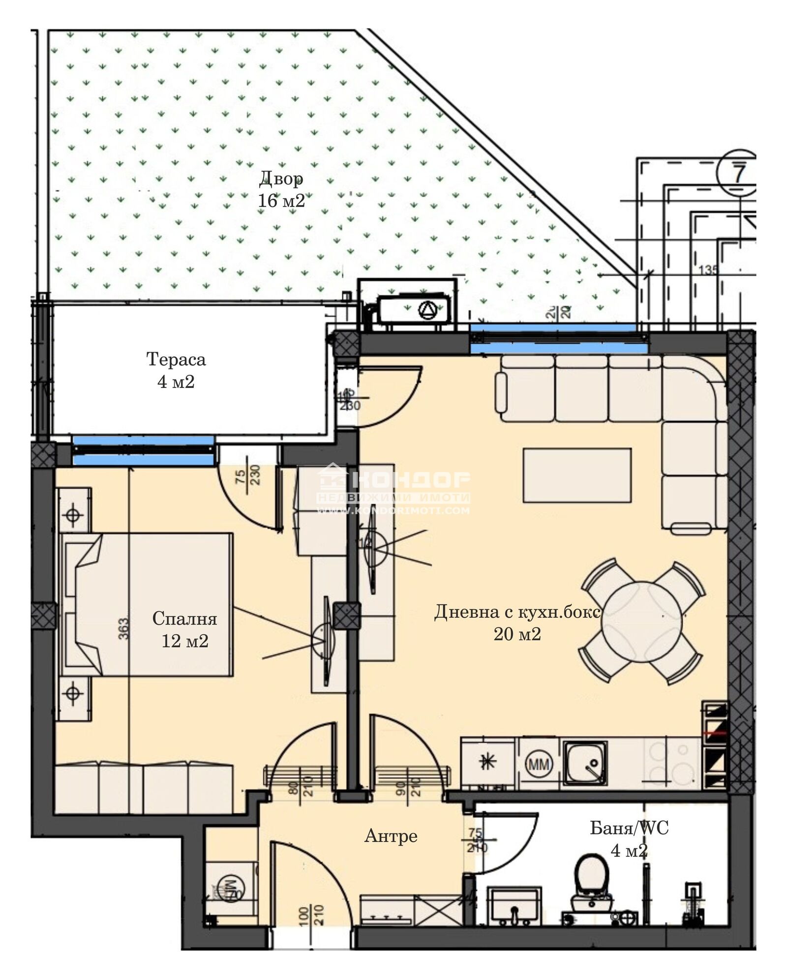 Оферта 67484: Бутиков затворен жилищен комплекс с модерна и устойчива архитектура, потопена в богато озеленени площи, вдъхващи на живущите комфорт и спокойствие. Комплекса предлага просторна спокойна среда с бърз достъп до центъра на града, както и възлови булеварди. Предлагаме ви имот, който се състои от дневна с трапезария и кухненска част, спалня, баня с тоалетна, входно антре с място за перално, една веранда и двор. В близост са ситуирани ресторанти, хипермаркети, училища и детски градини. Ще бъдат изградени луксозни общи части с предоставено облагородено дворно място, пейки за отдих и детски площадки за игра. Апартаментите ще бъдат издадени на: Стени и тавани гипсова мазилка, Под - циментова замазка; Под в санитарни помещение циментова замазка; Стени в санитарни помещения вароциментова мазилка, Тераси /под/ - мразоустойчив гранитогрес. Входни врати на апартаменти блиндирани.ВИЖТЕ ОЩЕ ИЗГОДНИ ОФЕРТИ НА https://www.kondorimoti.com/ С ЕЖЕДНЕВНА АКТУАЛИЗАЦИЯ!