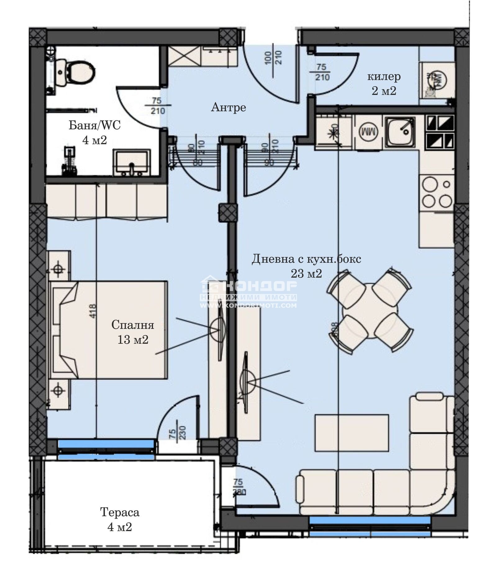 Оферта 67487: Бутиков затворен жилищен комплекс с модерна и устойчива архитектура, потопена в богато озеленени площи, вдъхващи на живущите комфорт и спокойствие. Комплекса предлага просторна спокойна среда с бърз достъп до центъра на града, както и възлови булеварди. Предлагаме ви двустаен апартамент с изцяло южно изложение, състои се от дневна 23кв.м. с трапезария и кухненска част, самостоятелна спалня 13кв.м., баня с тоалетна, входно антре с място за гардероб, склад и една обща тераса. В близост са ситуирани ресторанти, хипермаркети, училища и детски градини. Луксозни общи части с предоставено облагородено дворно място, пейки за отдих и детски площадки за игра.