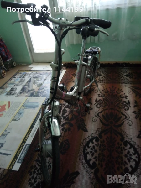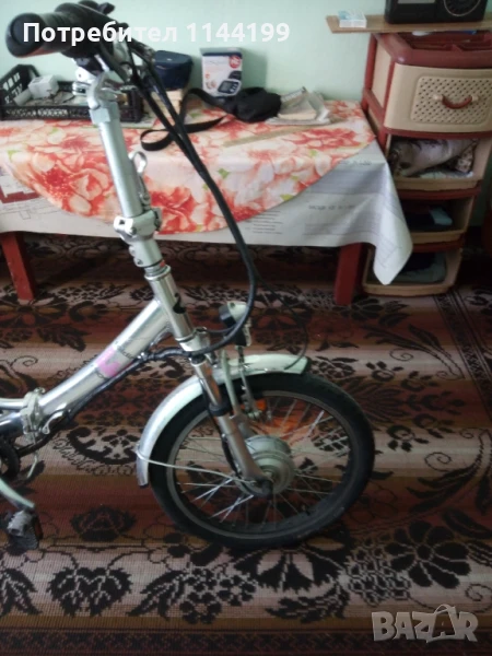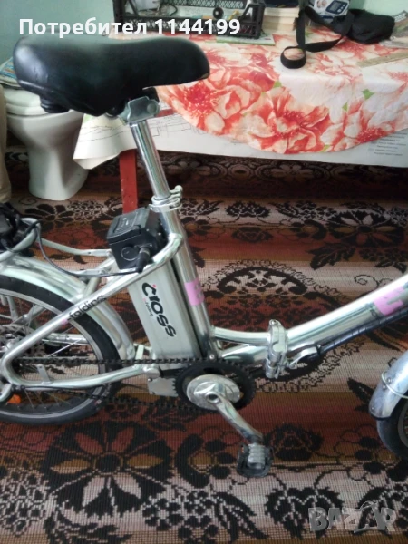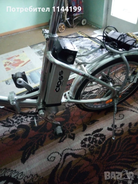 Продавам електрическо колело "Cross E - folding CB 201", сребрист цвят, 20-цолово, сгъваемо, със зарядно устройство. Команди "Shimano", с три предавки и ролкова спирачна система V-brake, 6 нива на подпомагане с педалите. Литиево-йонна сменяема батерия 36 V, /10,4 Ah. При пълно зареждане и подпомагане с педалите има пробег до 70 километра. Двигател - 250 W. LCD дисплей показващ преглед на скоростта общото и моментното изминато разстояние, индикатор на батерията. Кормилото и тръбата на седялката се регулират ръчно. Колелото има преден фар и заден светещ стоп. Предната вилка е с предно окачване и амортисьор.