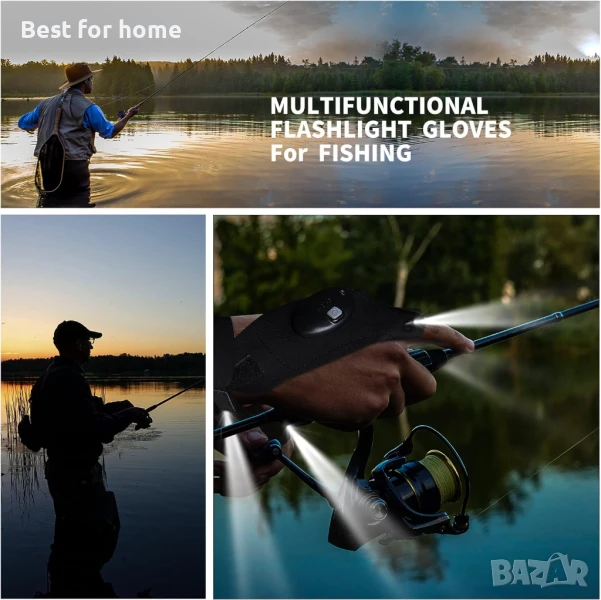 Сцени на приложение: LED риболовни ръкавици с интуитивен бутон за включване/изключване на повърхността, с допълнителни LED светлини, разположени на показалеца и палеца, позволяващи прецизно осветяване, където е необходимо. Идеални за нощни дейности на открито, като риболов, лов, бягане, ремонти, къмпинг, туризъм и колоездене.