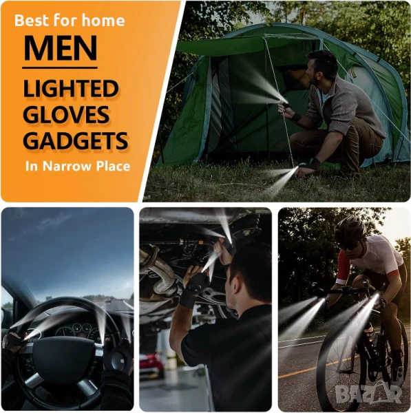 Готина джаджа за мъже: Ръкавиците с фенерче, функциониращи като преносими фенерчета, могат да се носят директно на ръцете ви. Компактни и леки, те са изключително лесни за употреба. Те служат като отлични помощници, предлагайки трета ръка при работа в слабо осветена среда.