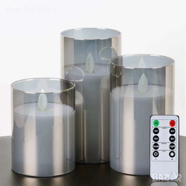 Комплект от 3 свещи (В-4", 5", 6" x Д-3"), LED стъклени чашковидни безпламъчни електрически свещи с трептящ изкуствен фитил, сиво стъкло - захранвани с батерии AA с дистанционно управление, за домашен декор, подарък за рожден ден, сватба и всяка друга декорация, комплект от 3 [БАТЕРИИ ВКЛЮЧЕНИ].