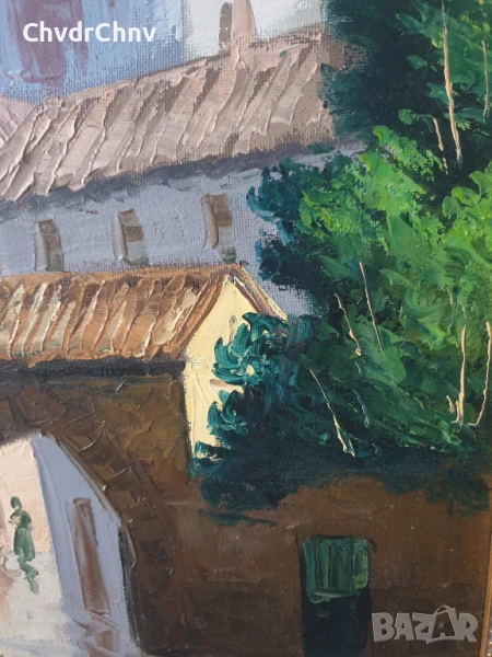 Техника масло върху платно (отлично състояние, запазени бои), масивна дървена рамка (тежка, широка), дървена подрамка със стабилизиращи клинове в ъглите.