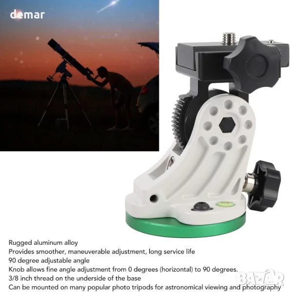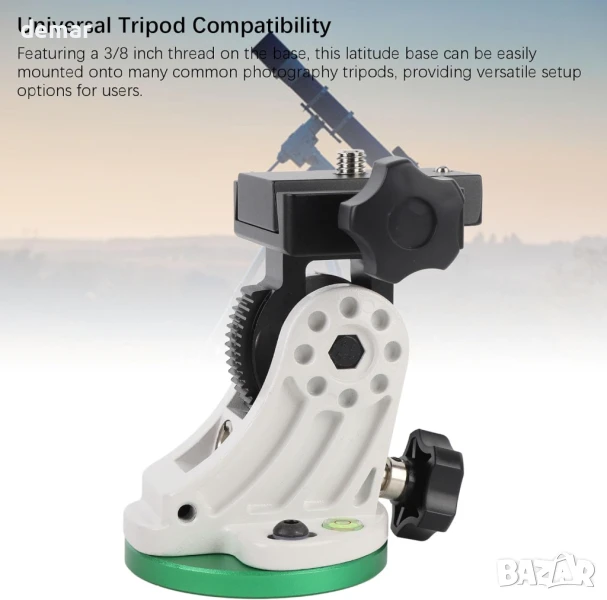 Тази седалка за регулиране на географската ширина е изработена от издръжлива алуминиева сплав за надеждни, плавни настройки и дълготрайна употреба. Тя разполага с гъвкав диапазон на ъгъла от 0 до 90° за прецизна настройка, идеална както за астрономическа, така и за слънчева фотография. Съвместима със Sky Watcher, Star Field и подобни устройства, тя опростява подравняването на осите и функционира като преносима платформа за проследяване. Основата включва универсална резба 3/8 инча, подходяща за повечето фотографски стативи, и поддържа широка гама от оборудване, включително тракери, телескопи и камери, които отговарят на спецификациите на монтажната плоча.