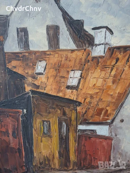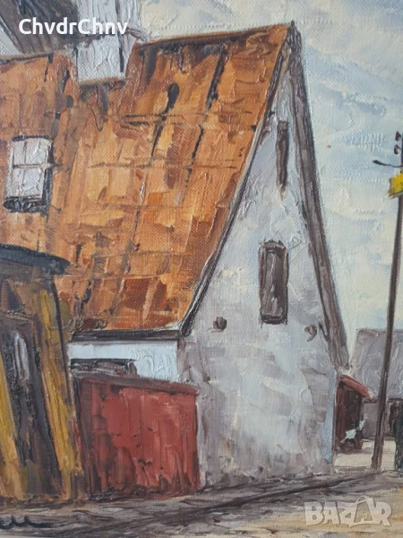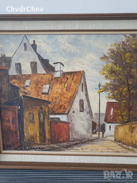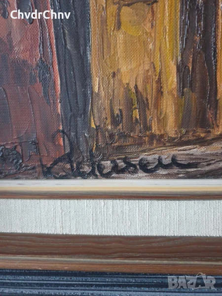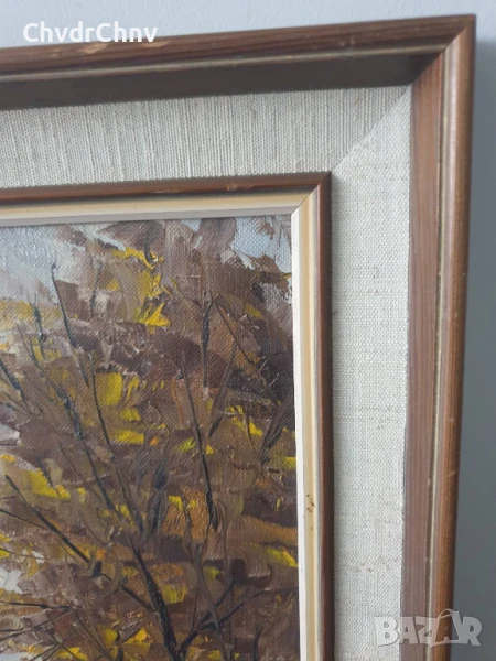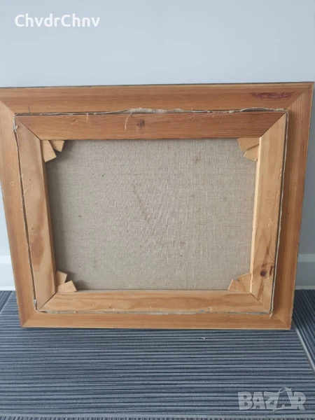 Техника масло върху платно (отлично състояние, запазени бои), дървена рамка, втора/вътрешна рамка (с паспарту), дървена подрамка (за платното) със стабилизиращи клинове в ъглите.