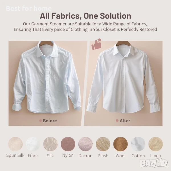 ПОДХОДЯЩ ЗА ВСИЧКИ ВИДОВЕ ПЛАТОВЕ: Мощният уред за гладене с пара ефективно и нежно премахва гънките от дрехите. С общо 11 различни режима, той е подходящ за всички видове тъкани, както и за домакински предмети.