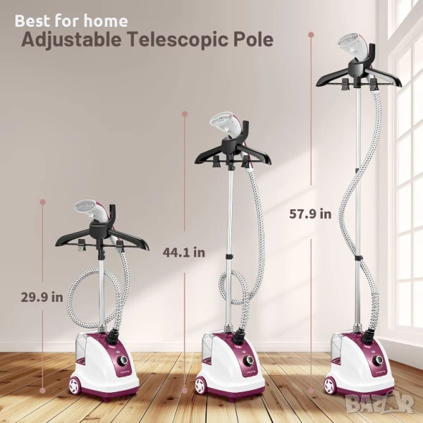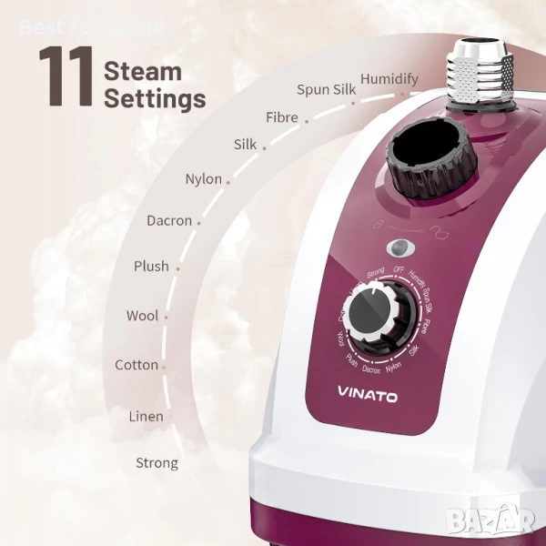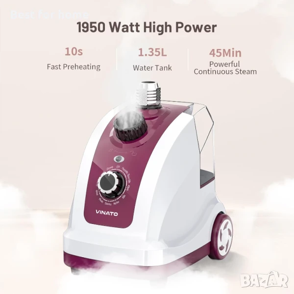 【2000W ВИСОКОЕФЕКТИВЕН ВЕРТИКАЛЕН ПАРОГРЕТ】Професионалният парогрейдър за дрехи VINATO се загрява за по-малко от 10 секунди и осигурява мощна и постоянна пара, която лесно премахва гънки от различни дрехи и премахва 99,99% от вирусите и бактериите с пара.