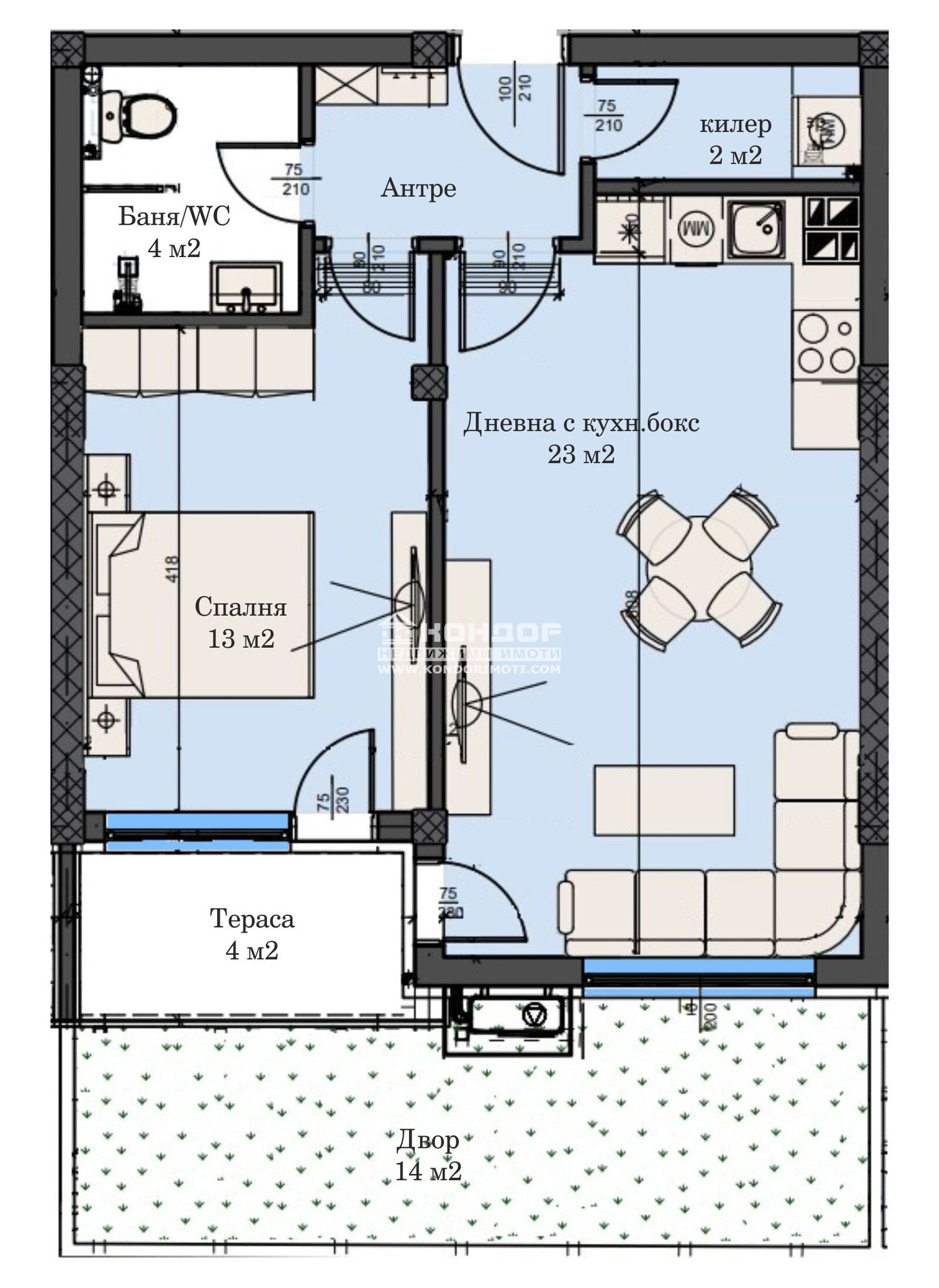 Оферта 67481: Бутиков затворен жилищен комплекс с модерна и устойчива архитектура, потопена в богато озеленени площи, вдъхващи на живущите комфорт и спокойствие. Комплекса предлага просторна спокойна среда с бърз достъп до центъра на града, както и възлови булеварди. Предлагаме ви двустаен апартамент с южно изложение, състои се от дневна с трапезария и кухненска част, спалня, баня с тоалетна, широко входно антре, склад, веранда и двор. В близост са ситуирани ресторанти, хипермаркети, училища и детски градини. Ще бъдат изградени луксозни общи части с предоставено облагородено дворно място, пейки за отдих и детски площадки за игра. Апартаментите ще бъдат издадени на: Стени и тавани гипсова мазилка, Под - циментова замазка; Под в санитарни помещение циментова замазка; Стени в санитарни помещения вароциментова мазилка, Тераси /под/ - мразоустойчив гранитогрес. Входни врати на апартаменти блиндирани.ВИЖТЕ ОЩЕ ИЗГОДНИ ОФЕРТИ НА https://www.kondorimoti.com/ С ЕЖЕДНЕВНА АКТУАЛИЗАЦИЯ!