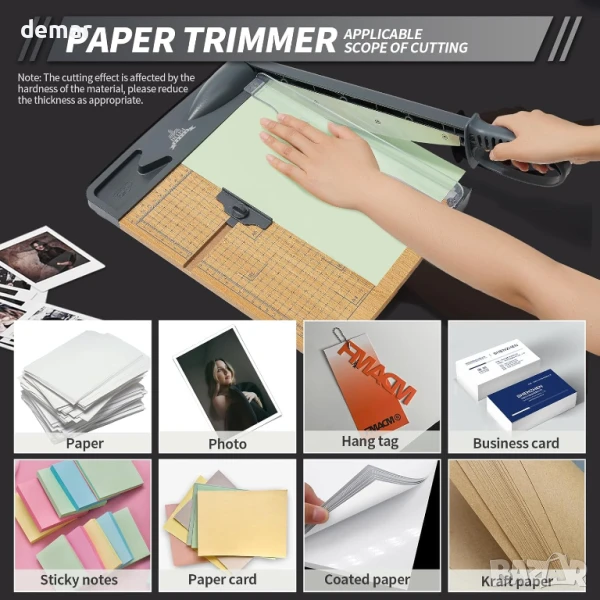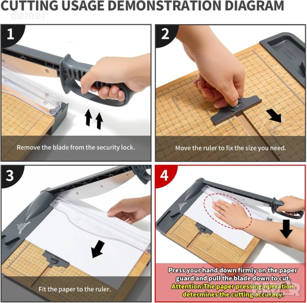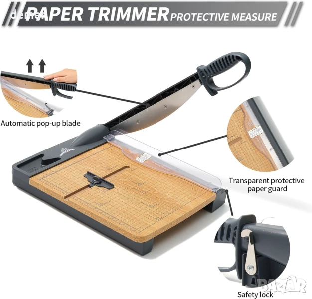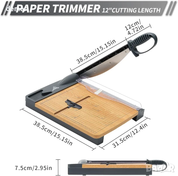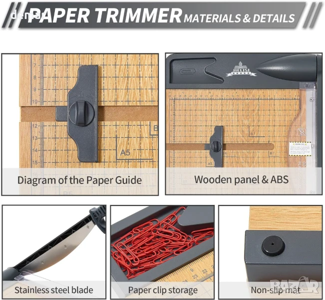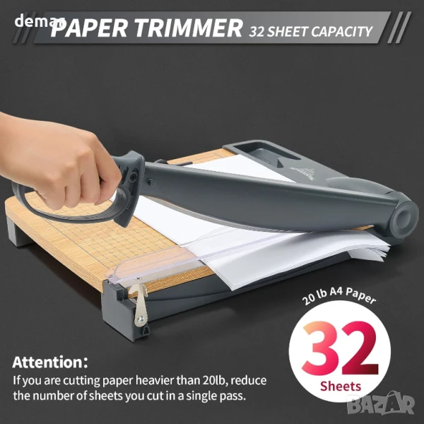 Този здрав нож за хартия реже чисто до 32 листа хартия A4 и работи добре с картон и фотохартия. Той разполага с прецизна решетка за подравняване със сантиметрови и инчови скали за точно рязане на различни размери хартия, включително A4, A5, B5 и други. Здравата дървена основа с неплъзгащи се гумени крачета осигурява стабилна употреба без вибрации - идеална за детайлни задачи като изработване на материали за творчество или покани. Безопасността е приоритет с предпазител на острието, дизайн с автоматично отскачане и сигурно заключване на острието. Подходящ за рязане на хартия, снимки, етикети, картички и други хартиени материали.