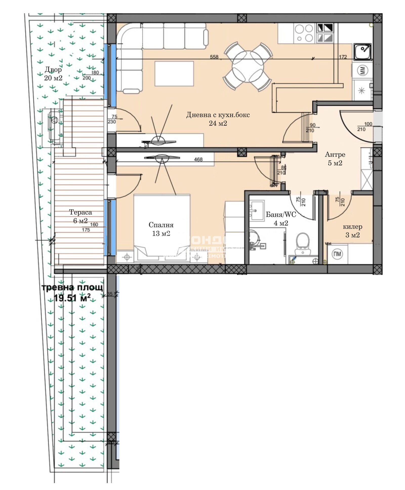 Оферта 65166: Бутиков затворен жилищен комплекс с модерна и устойчива архитектура, потопена в богато озеленени площи, вдъхващи на живущите комфорт и спокойствие. Комплекса предлага просторна спокойна среда с бърз достъп до центъра на града, както и възлови булеварди. Предлагаме ви двустаен апартамент с изцяло южно изложение, състои се от дневна с трапезария и кухненска част 24кв.м.,голяма самостоятелна спалня 13кв.м., баня с тоалетна, широко входно антре с място за гардероб, склад/перално помещение, една веранда и собствен двор. В близост са ситуирани ресторанти, хипермаркети, училища и детски градини. Ще се изградят луксозни общи части с предоставено облагородено дворно място, пейки за отдих и детски площадки за игра.