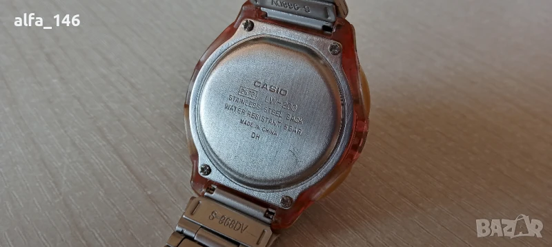 Дамски часовник Casio LW-200D-4AVEF - Часовникът е с нормални следи от употреба, като цената е съобразена с това. Часовникът и функциите му работят без проблем. Часовникът разполага със стандартните функции за часовниците Касио - 12/24 - часов формат, автоматичен календар, аларма, сигнал на всеки кръгъл час, осветление на дисплея, хронометър и е водоустойчив. Също така разполага и с второ време. Часовникът е с оригиналната си верижка, изработена от неръждаема стомана.