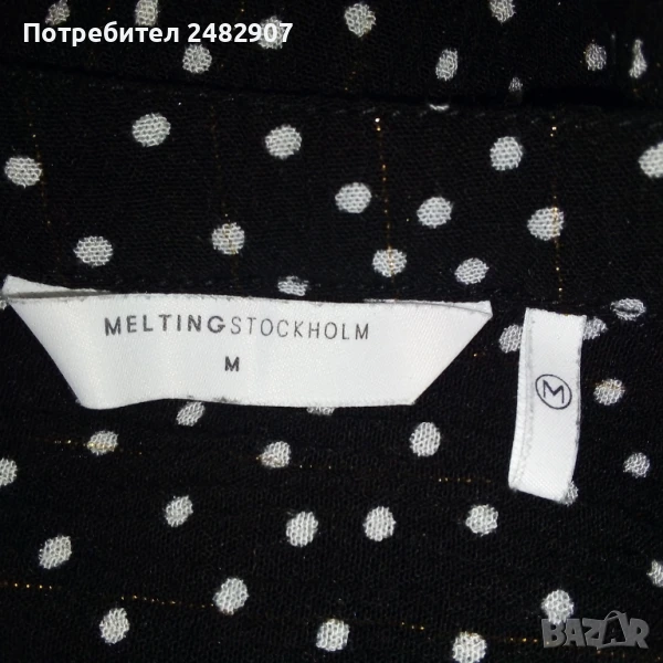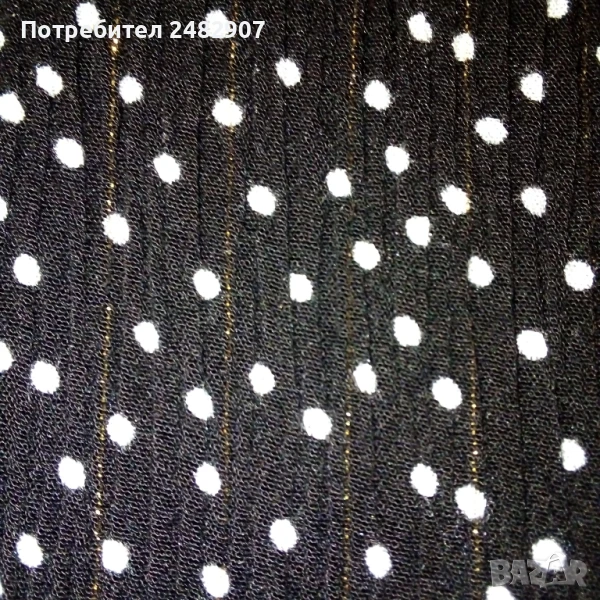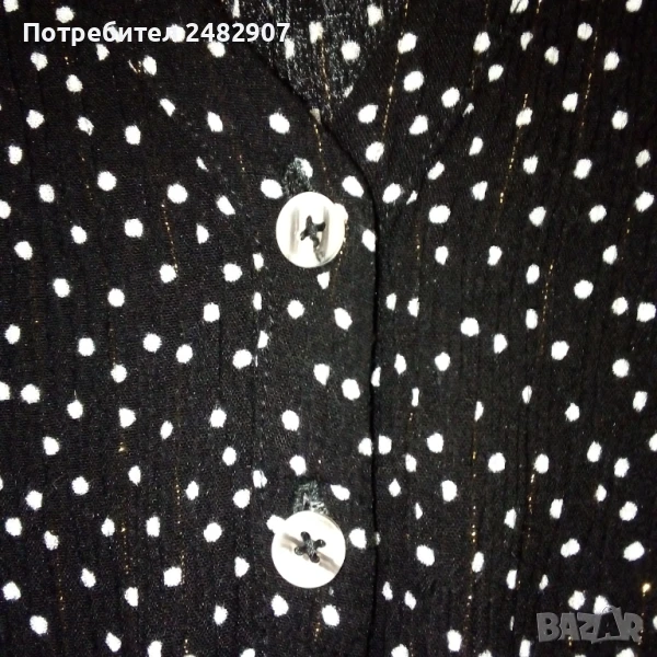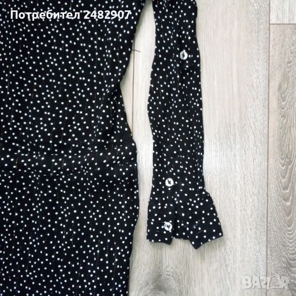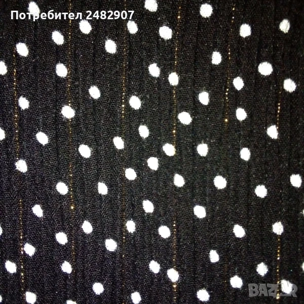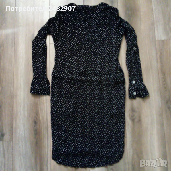 Черна къса кенарена рокля на бели точки и с блестящи нишки, размер М. Съдържа 100 % вискоза. Ширина я раменете - 34 см, ширина под мишниците - 42 см, ширина в талията - 42 см, ширина в долната част - 40 см, дължина от рамото до долу - 85 см (отпред) и 88 см (отзад), дължина на ръкава от рамото - 56 см, ширина на ръкава в долната част - 9,5 см. Много запазена, почти не е използвана, с колан на талията, два джоба и закопчаване с 4 броя копчета от талията до горе отпред. Ръкавите могат да се регулират на къси и да се фиксират с копчета. Много удобна, леко разтеглива, не се мачка.