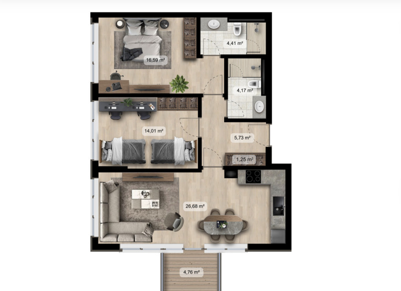 * 2 жилищни кули (западна - 11 етажа и източна - 13 етажа), апартаменти с 1, 2 и 3 спални, апартаменти на две нива с прилежащ двор;