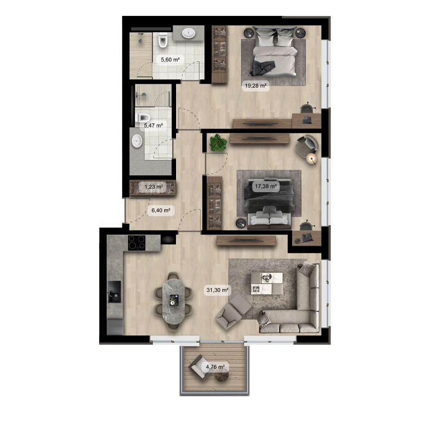 * 2 жилищни кули (западна - 11 етажа и източна - 13 етажа), апартаменти с 1, 2 и 3 спални, апартаменти на две нива с прилежащ двор;