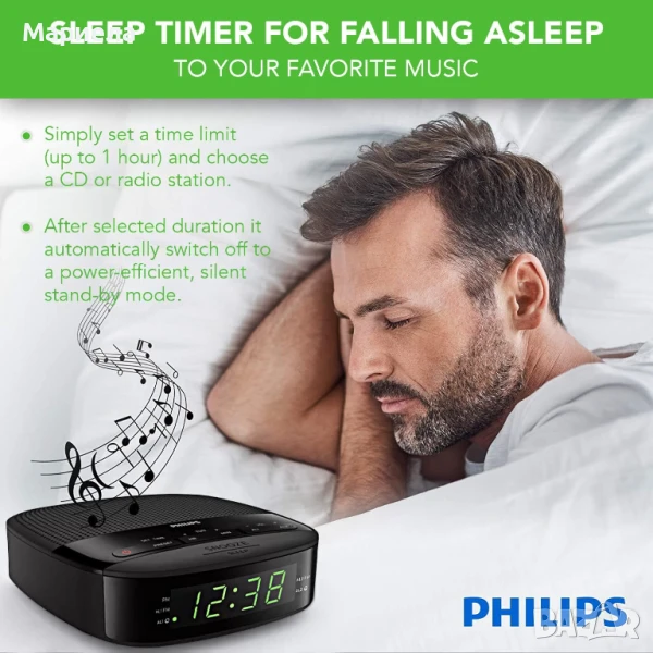 Таймерът за заспиване ви позволява да решите колко дълго искате да слушате музика . Просто задайте времево ограничение (до 1 час) и изберете радиостанция, която да слушате, докато заспите. Радиото Philips ще продължи да свири за избраното време и след това автоматично ще се изключи . Таймерът за заспиване ви позволява да заспите с любимата си музика .