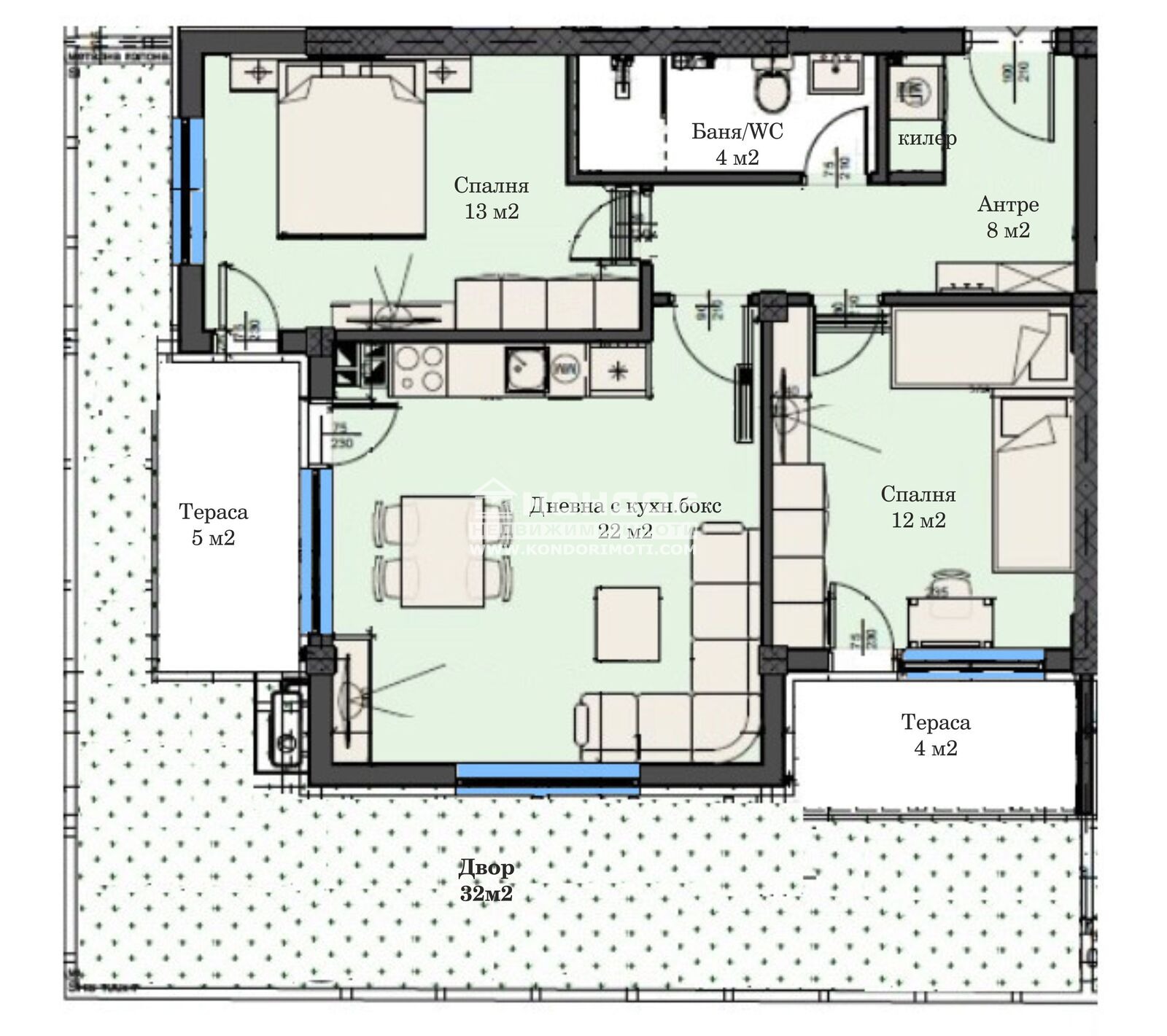 Оферта 67482: Бутиков затворен жилищен комплекс с модерна и устойчива архитектура, потопена в богато озеленени площи, вдъхващи на живущите комфорт и спокойствие. Комплекса предлага просторна спокойна среда с бърз достъп до центъра на града, както и възлови булеварди. Предлагаме ви тристаен апартамент с изложени юг/запад, състои се от дневна с трапезария и кухненска част, две самостоятелни спални, баня с тоалетна, широко входно антре с място за гардероб, перално помещение, две тераси и двор. В близост са ситуирани ресторанти, хипермаркети, училища и детски градини. Луксозни общи части с предоставено облагородено дворно място, пейки за отдих и детски площадки за игра.