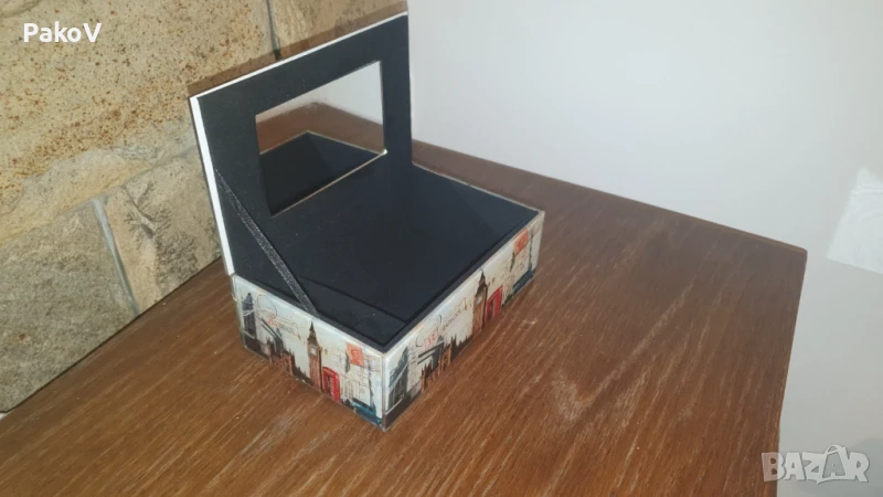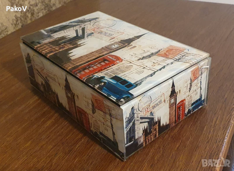 Стилна дървена бижутерка с винтидж принт „Лондон“ – идеална за вашите бижута, малки ценности и сувенири от пътешествия. Капакът е декориран с емблематични силуети: Биг Бен, телефонна кабина, Тауър Бридж и ретро автомобил. Вътре е облицована с мека дамаска, която предпазва бижутата от надраскване.
