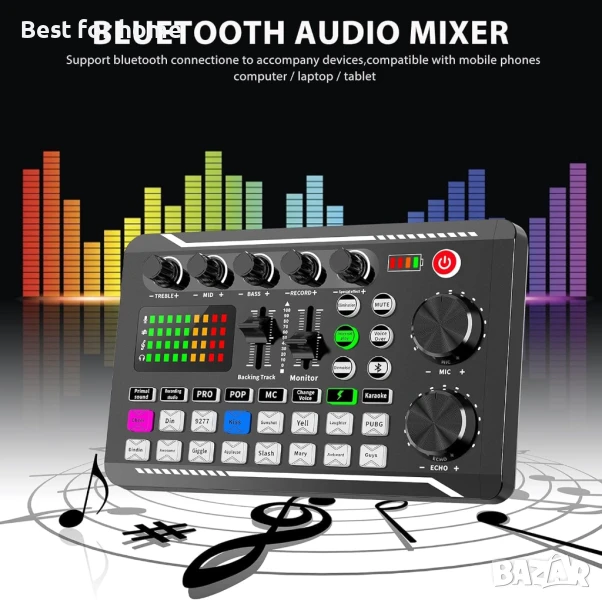 【Професионална звукова карта F988】Изпитайте звук от най-високо качество с нашата най-нова звукова карта F988 за живо! Проектирана с импортиран двоен DSP чип, безжичен Bluetooth акомпанимент, прецизна настройка с двоен двигател и усъвършенствана интелигентна система за управление на светлината, която ще освети вашия концерт в ритъма на музиката, правейки го още по-вълнуващ. Светлините на конзолата могат да се управляват от логото на Lightning на конзолата.