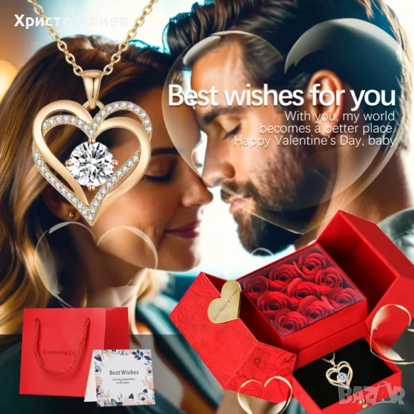 Златно колие с камъни в луксозна кутия с рози Романтичен Подарък