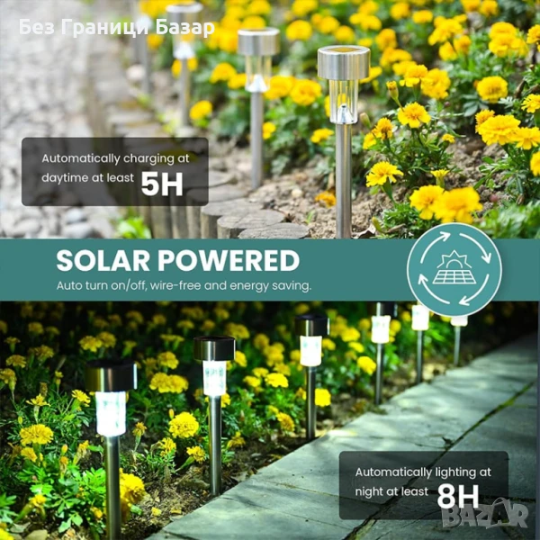 Работят автоматично – зареждане през деня (6ч), светене през нощта (8ч)