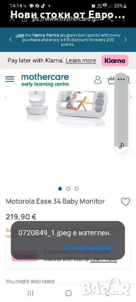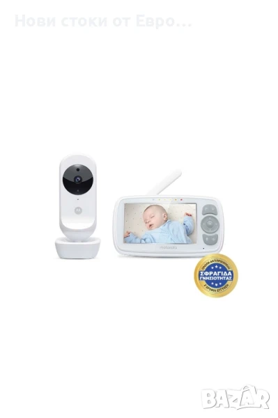 Видео бебефон Motorola - Ease 34 Видео бебефонът Motorola - Ease 34 разполага с голям 4.3-инчов дисплей, за да получите ясен изглед към детето и лесно да управлявате функциите на камерата. Той разполага с функция за цифрово увеличение и дава възможност да следите температурата в стаята, за да се уверите, че е подходяща за Вашето бебе. Говорете и чувайте бебето си с функцията за двупосочно говорене. Разполагате и с приспивни, успокояващи звуци или аудиокнига, без да влизате в детската стая. Можете да поддържате връзка в дома си с обхват до 300 метра, а с микрофона с висока чувствителност няма да пропуснете и звук. Характеристики: Мониторинг: Устройство за родителски контрол; Свързаност: 2,4 GHZ FHSS безжична свързаност за домашно гледане; Диапазон обхват: до 300 метра; Цифрово увеличение; Нощно виждане; Температурен сензор; Двупосочна комуникация; Възможност за разширение (Свързване на до 4 камери към един акаунт на Hubble акаунт).