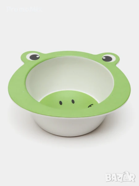Комплекта за хранене е с дизайн на жабка и включва 5 броя части, като чиния с три разделения, купа, чаша, вилица и лъжица.