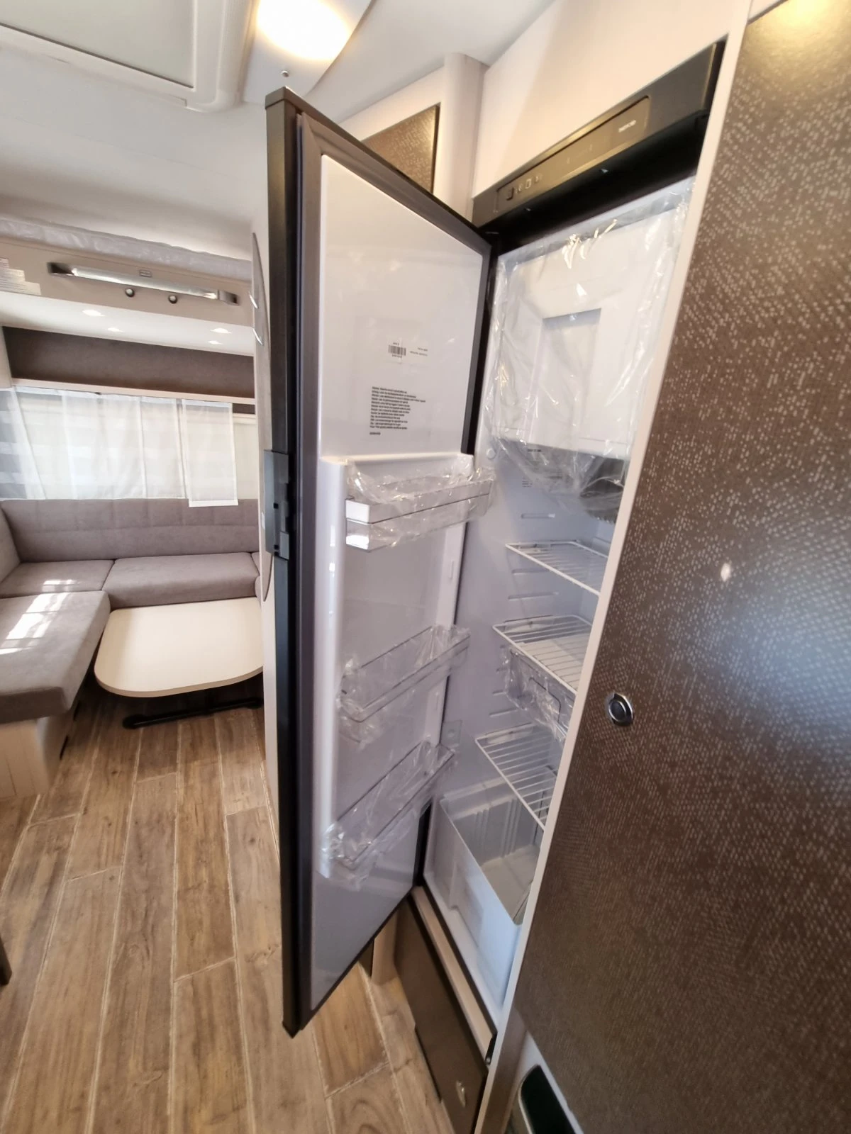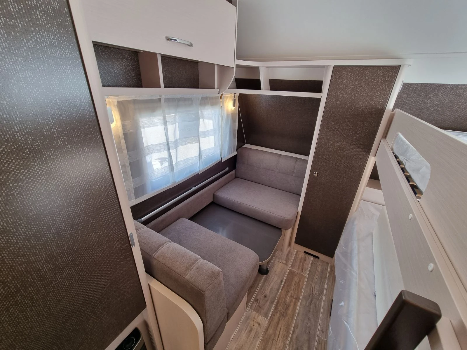 Падащо легло над дневен сет с размери 140 X 200cm Баня и тоалетна Кухненски бокс Хладилник - 142л. Отопление Truma S-3004 с автоматично запалване Допълнително оборудване: Акумулатор Ultimatron Lifepo4-100Ah Зарядно устройство Victron-30A Климатик Gree Бърза връзка за вода Газова бутилка