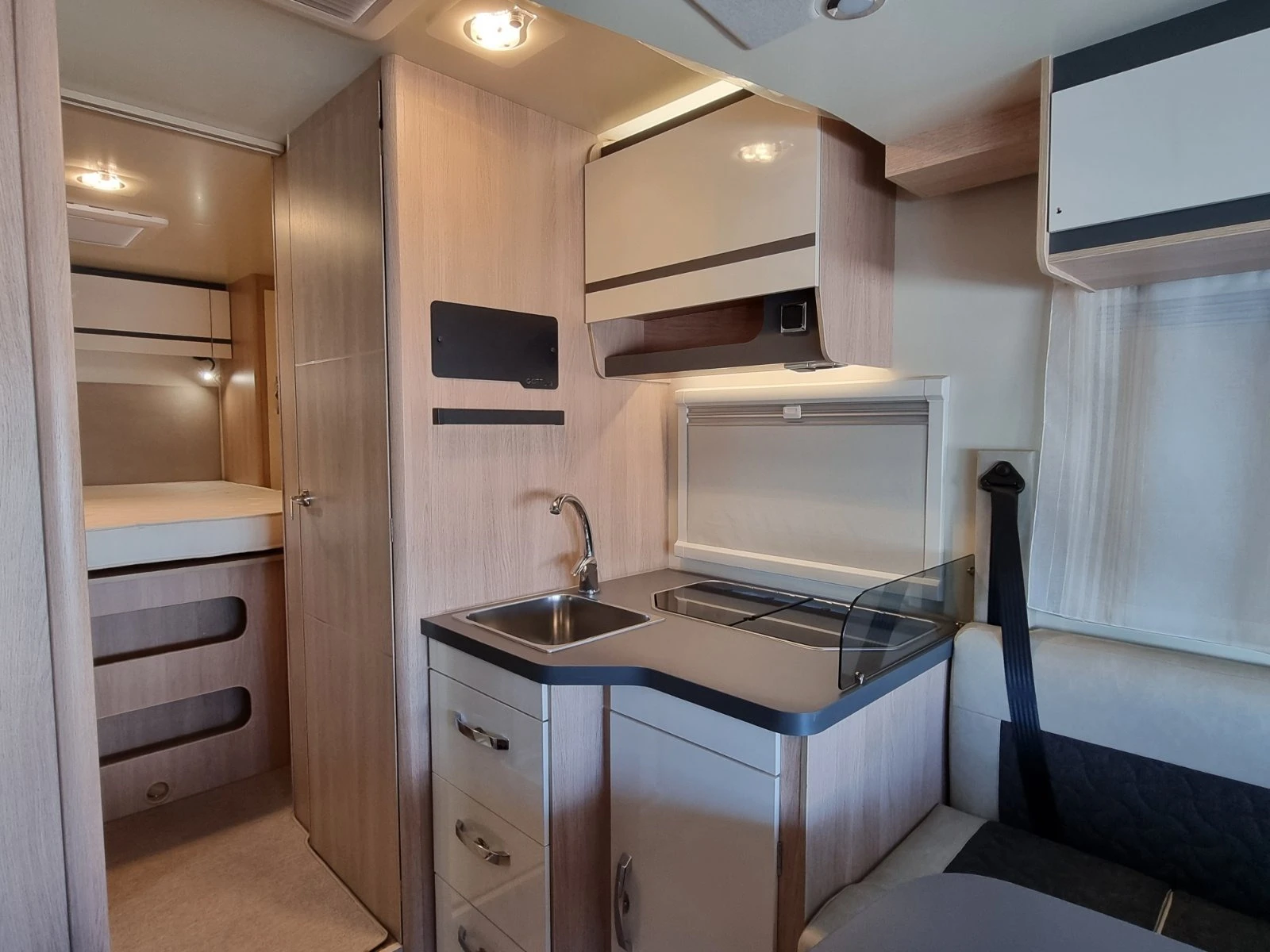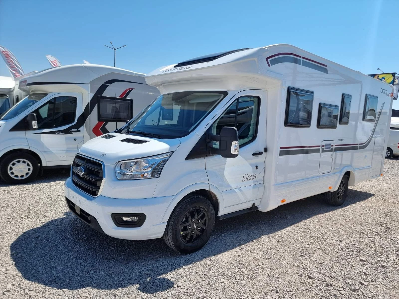 Camperisimo, официален вносител на марките Dethleffs, Giottiline и Sunlight. Внос на кемпери и каравани. Внос на най-добри цени на кемпери от марките Hymer, Mobilvetta, Roller Team, Challenger, PLA, Notin. Над двеста кемпера налични за доставка до три дни. Ново - Giottiline Siena 397 Ценоразбивчът на пазара! Полуинтегриран кемпер на базата на Ford Transit Двигател 170к. с. Скоростна кутия автоматична ESP Traction+, Hill Holder, Hill Descent Start & Stop Tempomat 16" Алуминиеви джанти 2DIN Radio Ford Дължина 7. 4м Ширина 2. 32м Височина 2. 99м Брой места за пътуване - 4 Брой места за хранене 5 Брой места за спане - 4 Климатик към двигателя, круиз контрол, дневни светлини Въздушни възглавници за водача и пътника Електрически странични огледала Мултимедия Мултиволан Камера за заден ход Панел TRUMA CP PLUS iNet Въртящи се предни седалки Sky roof над кабината Вградени термо и слънцезащитни плисирани щори за затъмнение на шофьорската кабина 100% LED осветление Отопление и топла вода Truma Combi 4000 Gas Кралска спалня 190X150 см в задната част 190 x 142см Електрическо падащо легло над дневен сет 196x126 см Преобразуване на дневен сет в място за спане. Отделни баня и тоалетна. Резервоар за чиста вода 120 литра Резервоар за отпадни води 100 литра Врата отделяща спалнята от дневната Модерен кухненски бокс хладилник 150 литра, мивка и газови котлони. Гардероб и много шкафове и ниши за багаж Кожен волан Място за две