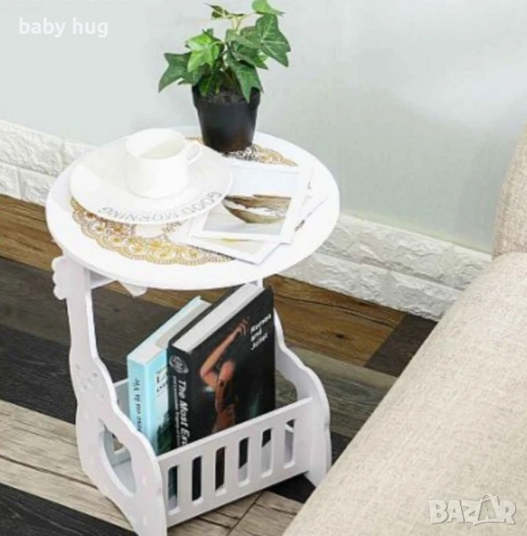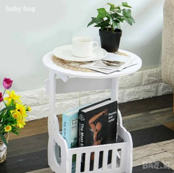 Бяла кръгла масичка с нощно шкафче. Може да се използва за съхранение на книги, списания, а отгоре да си държите чашата с кафе/чай.