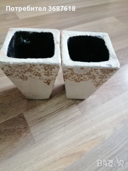 Стари саксии( кашпи) със златиста декорация в бароков стил с височина 14см. Цената е общо за двете.