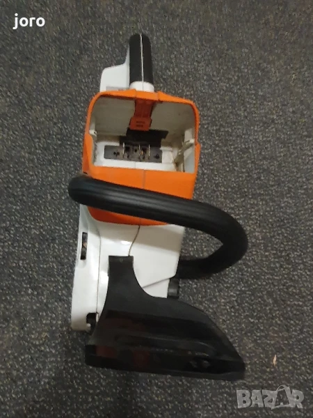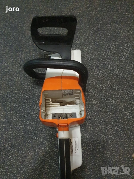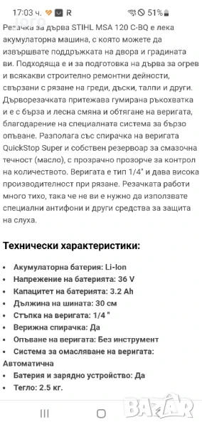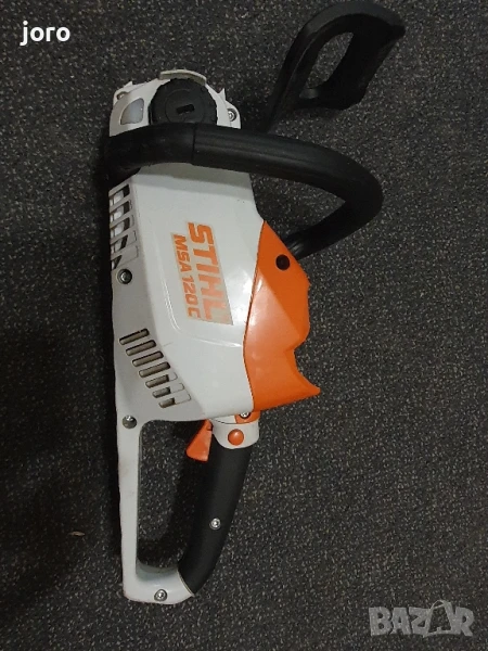 STIHL MSA 120 C-BQ е лека акумулаторна машина, с която можете да извършвате поддръжката на двора и градината ви. Подходяща е и за подготовка на дърва за огрев и всякакви строително ремонтни дейности, свързани с рязане на греди, дъски, талпи и други. Дърворезачката притежава гумирана ръкохватка и е с бърза и лесна смяна и обтягане на веригата, благодарение на специалната система за бързо опъване. Разполага със спирачка на веригата QuickStop Super и собствен резервоар за смазочна течност (масло), с прозрачно прозорче за контрол на количеството. Веригата е тип 1/4" и дава висока производителност при рязане. Резачката работи много тихо, така че не ви е нужно да използвате специални антифони и други средства за защита на слуха.Продава се само машината без дъска,верига,батерия и зарядно.