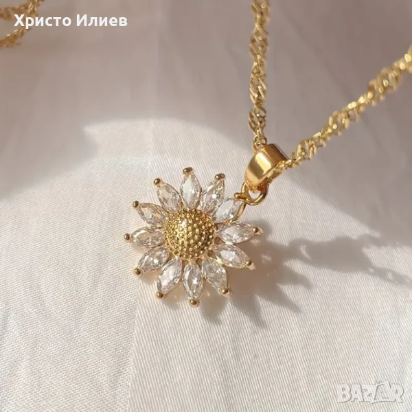 Златно Колие с камъни слънчоглед в подаръчна кутия с цвете тобичка и картичка