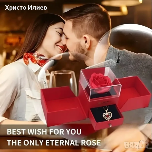 - Ще получите колие, искрящи вечни червени рози. Розите са перфектни и вечни, защитени от прозрачен акрилен калъф. Основата има малко чекмедже за колие. Червените рози изглеждат чудесно и като централен елемент в хола или спалнята.