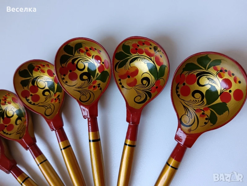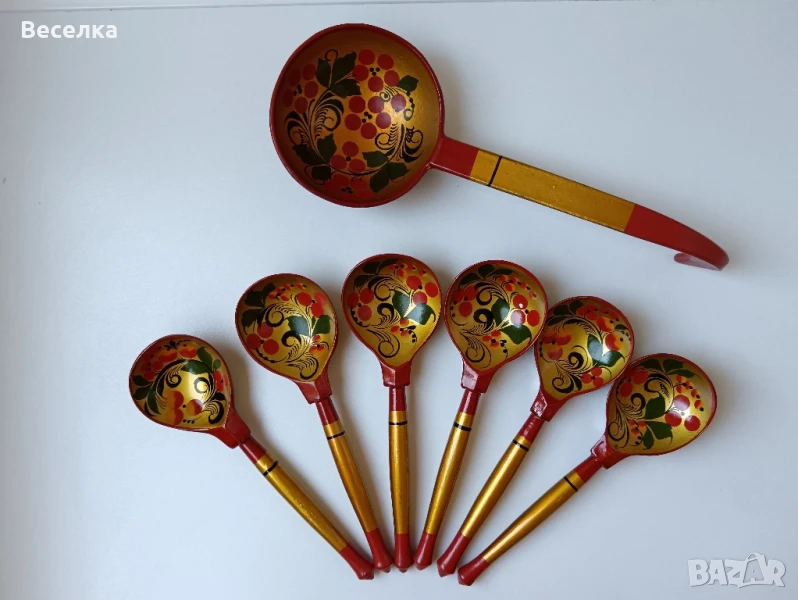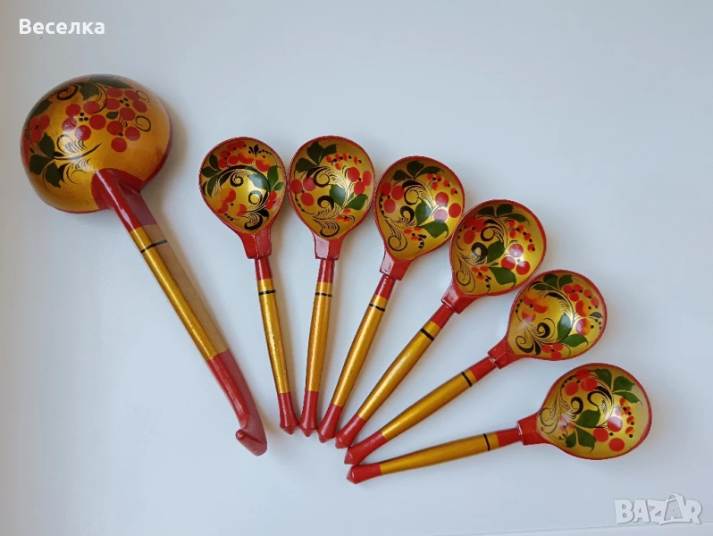 Руски дървени прибори - 6 бр лъжици и 1 черпак с декор горски плодове. Ръчно рисувани. Без забележки. Отлично състояние на боята. Дължина на черпака 28 см, на лъжичките 19 см.