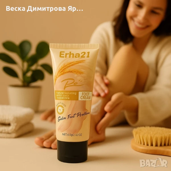 Продукт: Erha21 Крем за крака; Основен проблем: Напукани, сухи и груби пети; Решение: Интензивна хидратация и възстановяване с натурални овлажняващи съставки; Функции: Подхранва сухата кожа, стимулира регенерацията, омекотява грубите участъци, без аромат, подходящ за чувствителна кожа; Допълнителни ползи: Лека текстура и бързо попиване, не омазнява, подходящ за всекидневна употреба; Разфасовка: 60g / 2.12 oz.