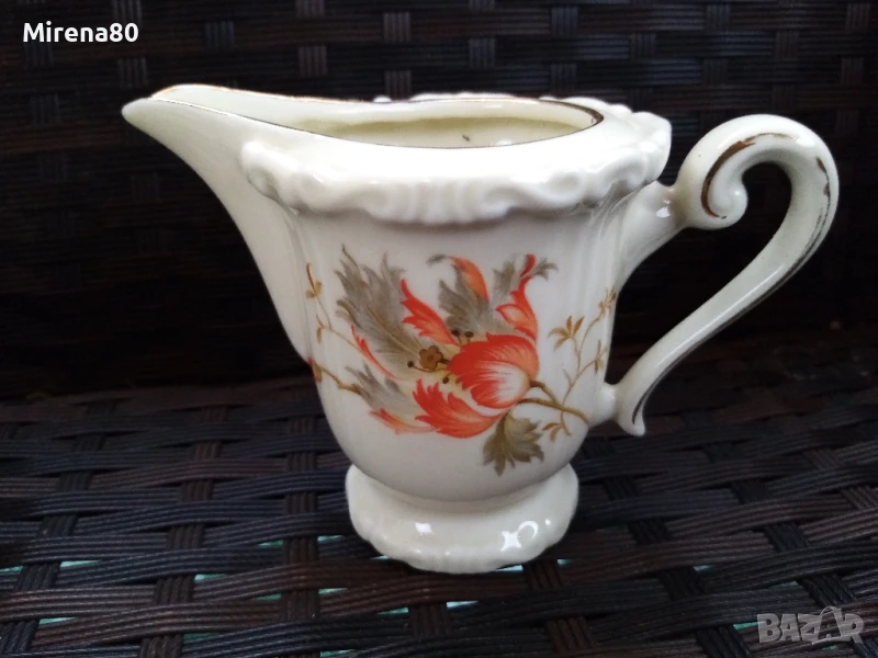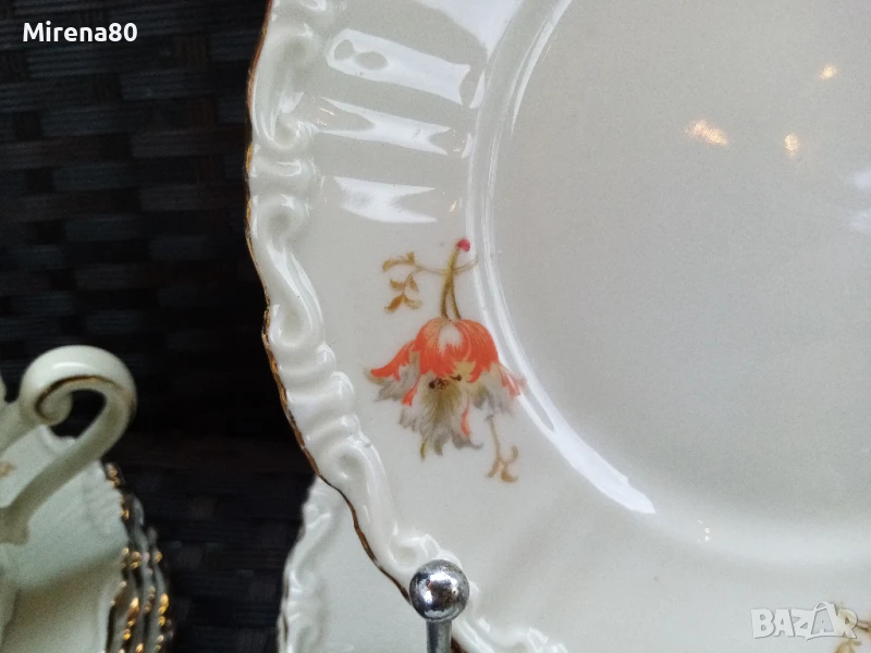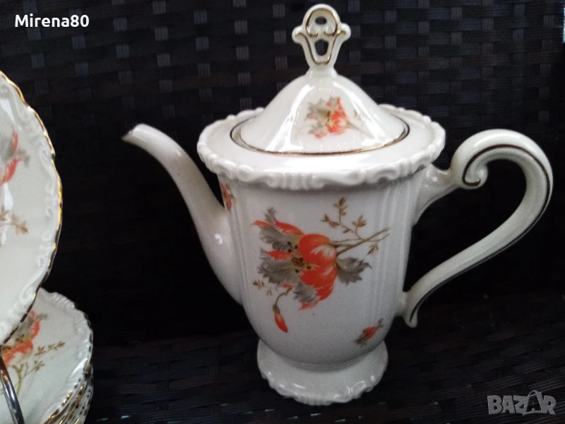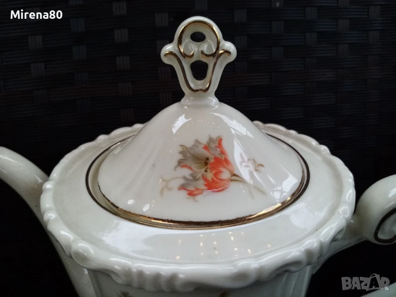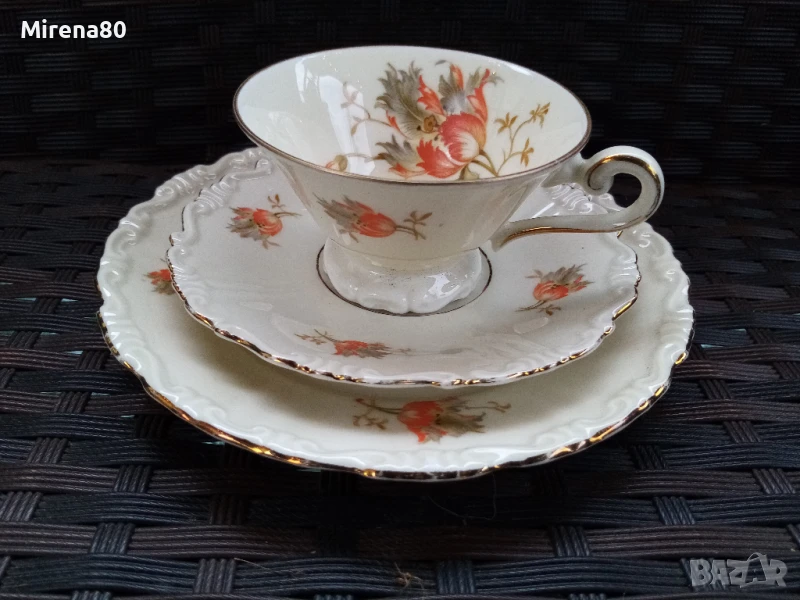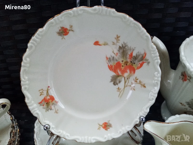 порцеланово здраве за годините си ! Фин лек порцелан в цвят екрю със златен кант и разкошен декор оранжево цвете. Чинийките са с къдрав борд и това носи много винтидж дух. Сервизът е истинско произведение на изкуството - от времето, когато всяко нещо се е правело с желание и без да се пестят труд и средства. Единствените следи от времето са лепена отвътре захарница (не се вижда затворена) и изтриване на канта тук там, най-вече по чинийките. Както се вижда, предвид модела, не дразни окото, дори напротив. Цветовете са ярки, живи - красота.