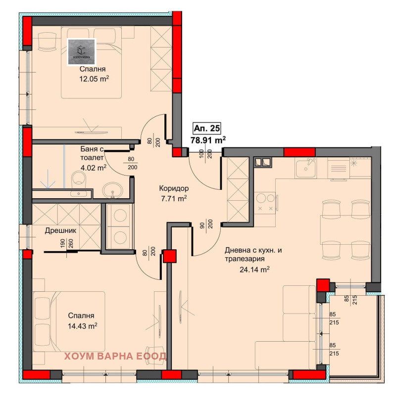 ДИРЕКТНО ОТ ИНВЕСТИТОР! Строителна фирма Хоум Варна ЕООД продава апартаменти и паркоместа в жилищна сграда в кв. Аспарухово, ул. Борис Киряков 4. На шест жилищни етажа са разположени 16 двустайни, 16 тристайни и 1 четиристаен апартаменти. На разположение на живущите ще бъдат 17 подземни и 19 дворни паркоместа. Отличен достъп, улично осветление и страхотна панорама към морето и града. Стартирало строителство. Етапи на завършване: Акт 14: март 2026 г., Акт 15: ноември 2026 г., въвеждане в експлоатация март 2027 г. БЕЗ ТАКСА ПОДДРЪЖКА. Апартаментът A-25 се състои от 2 спални, дневна с кухненски бокс и трапезария, баня с тоалетна, килер, коридор и лоджия. Имотът е с обща площ 89,69 кв.м, което включва 78,91 кв.м чиста жилищна площ и 10,78 кв.м общи части. Посочената цена e при схема на плащане 50/40/0/10. За повече информация: https://homevarna.bg/building/panorama-asparuhovo/