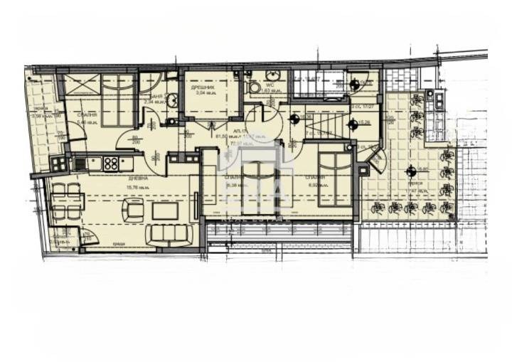 ЕРА Визия предлага за продажба четиристаен апартамент в сграда в начален етап, в района на Колхозен пазар. Имотът е със застроена площ 92,09 кв.м. (с общите части), разположен на 7, последен етаж. Състои се от: коридор, дневна с кухненски бокс (15,76 кв.м.) с излаз на тераса, три спални (5,49 кв.м., 6,92 кв.м, 6,36 кв.м), баня с WC (1,63 кв.м.), WC, дрешник (3,04 кв.м.), тераса (11,47 кв.м.), ведно с прилежаща изба (2,74 кв.м.).