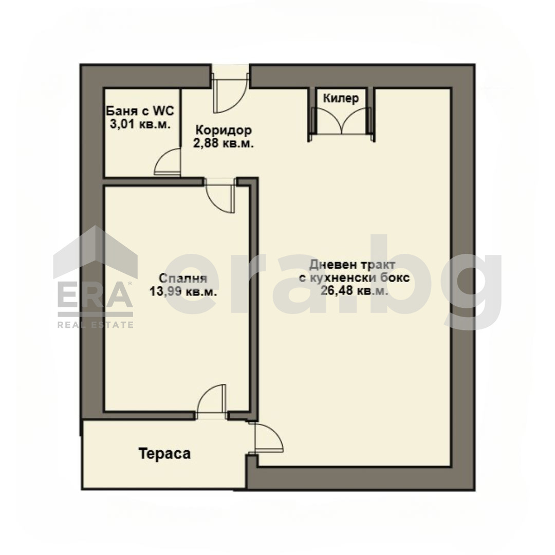 ЕРА Визия предлага за продажба двустаен апартамент в новострояща се кооперация в кв.'Възраждане' 1. с площ 66 кв.м. (с общите части). Имотът е разположен на 3 етаж от общо 11 и се състои от: коридор (2,88 кв.м.), дневна с кухненски бокс и трапезария (26,48 кв.м.), спалня (13,99 кв.м.), баня с тоалет (3,01 кв.м.), килер (0,72 кв.м.), тераса с излаз от двете стаи. Изложението е изцяло изток. Жилището е без преход и се предлага необзаведено.